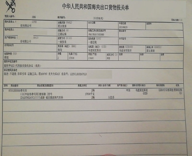 汽車出口報關。2019年06月20日協助汽車外貿公司從霍爾果斯口岸出口汽車到烏茲別克斯坦,當天通關審結,為汽車貿易出口通關提供了大大的便利! 天津報關行 代理報關 代理報檢 貨運